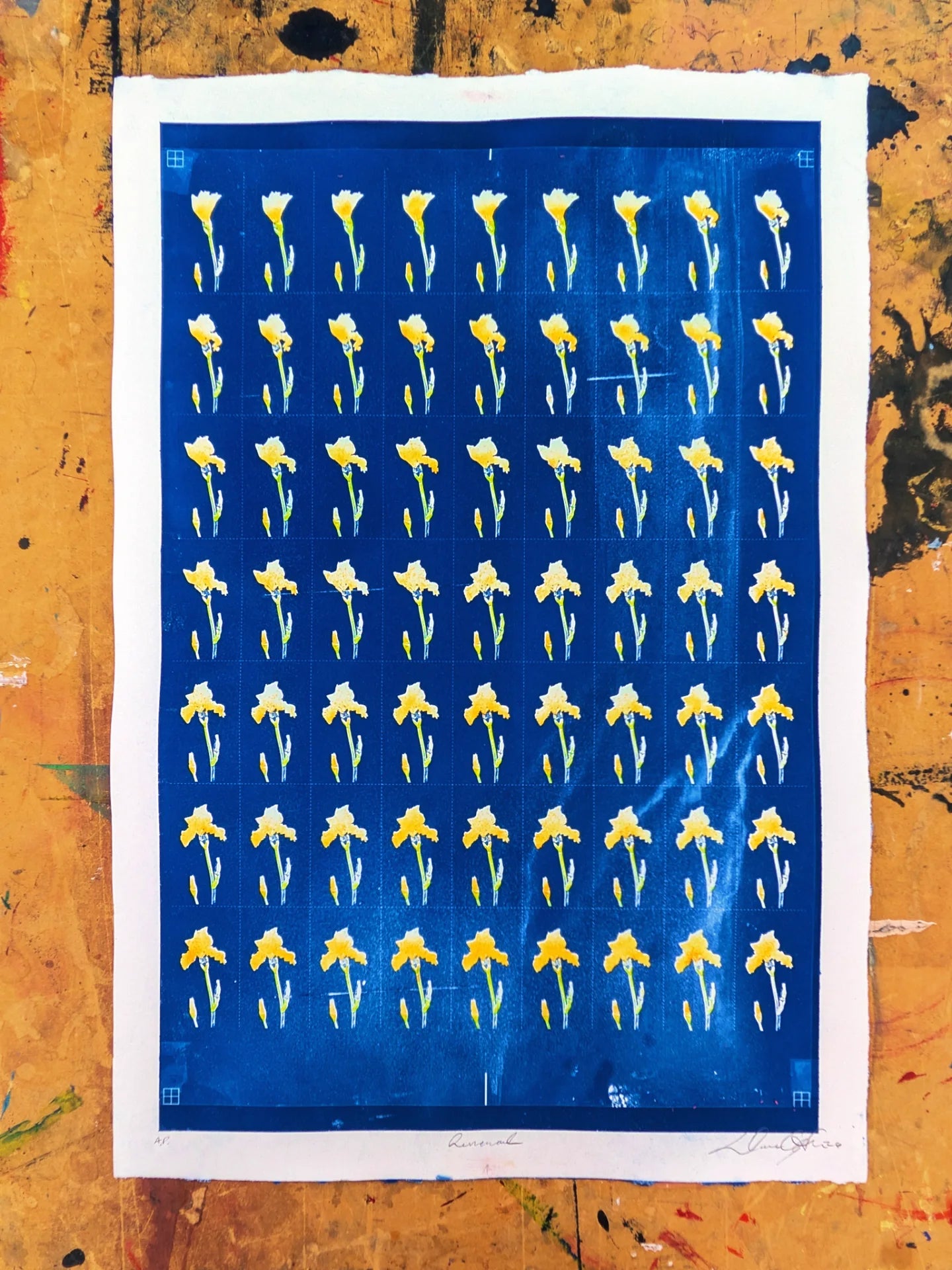 Renewal is cyanotype contact sheet. Each cell represents a frame in a 24 frames-per-second animation depicting a flower blooming to welcome spring.